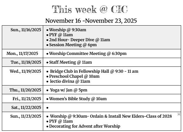 Decorating for Advent Sunday, 11/23/2025 Advent is such a special time as we wait with joyful anticipation for the coming of Christ! Please join us as we decorate CIC for Advent after the worship service on Christ the King Sunday. There will be no Second Hour. |